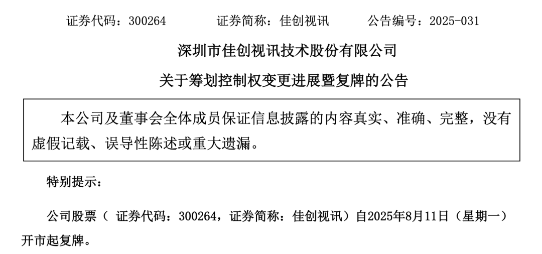 停牌5个交夙昔后,佳创视讯(300264)易主事项在8月10日晚间浮出水面,公司股票将于8月11日复牌。